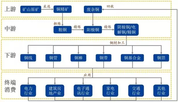 銅產(chǎn)業(yè)鏈包括采礦、煉銅、加工和終端消費(fèi)的整個(gè)過(guò)程。上游主要是開(kāi)采和篩選該礦的原礦,獲得了主要的原料銅精礦。中游地區(qū)主要是冶煉環(huán)節(jié),可直接用于精煉銅的加工(這里陰極銅、電解銅、精銅、精煉銅表示同一個(gè)含義),其中銅精礦冶煉精煉銅為初級(jí)精煉銅,回收廢雜銅精煉銅為精煉銅。下游主要是通過(guò)不同的加工工藝,將銅精煉成各種形狀的銅制品,如銅條、銅管、銅帶、銅箔等。最后,銅作為產(chǎn)品進(jìn)入消費(fèi)終端,其中最重要的終端是電力、建筑、房地產(chǎn)、電子、交通等行業(yè)。